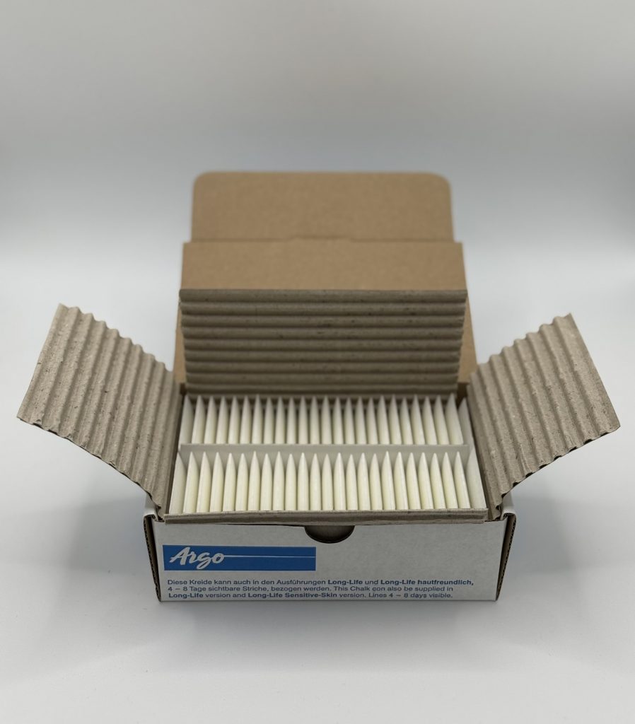 Dank ihres speziellen Wachsgemischs gleitet die Kreide leicht über die Oberfläche und hinterlässt gut sichtbare, wisch- und wasserbeständige Markierungen. Dadurch ist sie ideal für industrielle Anwendungen, Serienfertigungen und Arbeiten, bei denen die Markierung während des gesamten Produktionsprozesses bestehen bleiben muss.